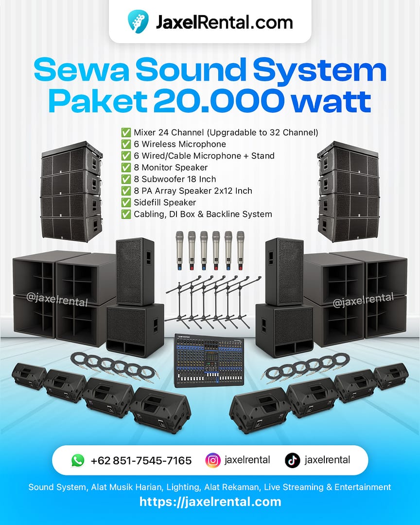 Butuh sound system gahar untuk konser, pensi, wedding besar, atau event premium? 🔊✨ Jaxel Rental hadir dengan paket 20.000 Watt yang siap bikin acara kamu pecah, jernih, dan meriah!